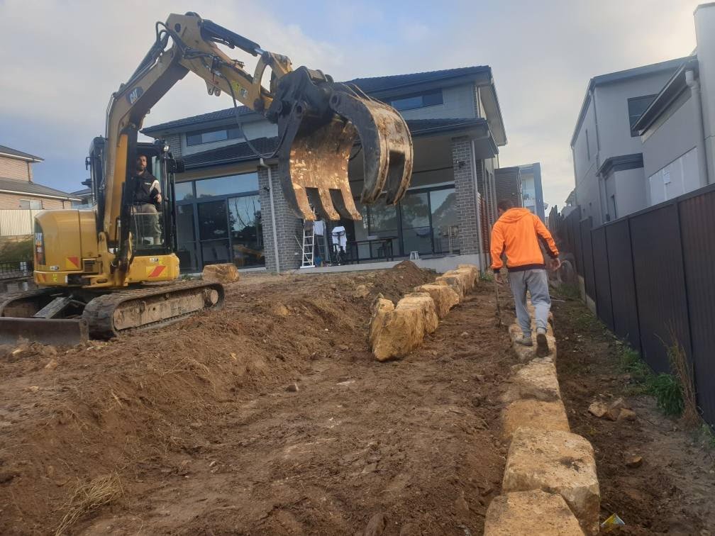 The All In One team recently completed this major transformation at a home in Kellyville, complete with stunning natural sandstone block retaining walls to seamlessly blend with the bushland surroundings. This project required a significant amount of beautiful, natural sandstone rock to comeplete the natural look to the project. Not only did this project include a large amount of excavation work, it entailed plenty of heavy work, which is a credit to the team.
